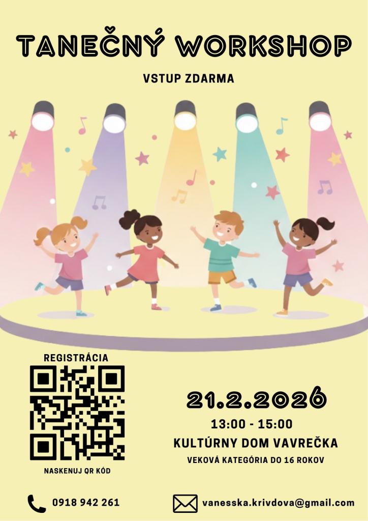 Srdečne vás pozývame na tanečný workshop, ktorý sa uskutoční 21. februára 2026 od 13:00 do 15:00 v Kultúrnom dome Vavrečka. Vstup je zdarma. Workshop je určený pre mladých vo veku do 16 rokov.