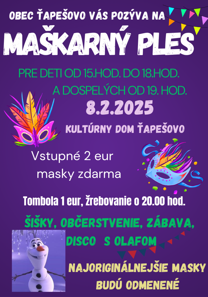V sobotu 8. februára 2025 sa konal v kultúrnom dome maškarný ples nie len pre deti ale aj dospelých. Kultúrny dom ,,praskal" od počtu detských masiek, ktorých sa zúčastnilo takmer 100. Najoriginálnejšie masky boli odmenené, každá maska však dostala sladkosť a milú pozornosť. Navštívili nás aj maskoti Olaf so svojou mini disko a rodinka tučniakou. Maškarný ples pokračoval aj pre dospelých. Dospeláci opäť nesklamali a prišli v originálnych maskách. Vo večených hodinách sa žrebovala tombola, výťažok z tomboly bol použitý na dobročinné účely. Ďakujeme všetkým sponzorom, občanom, organizátorom, ktorí takto prispeli k ,,dobrej veci".
